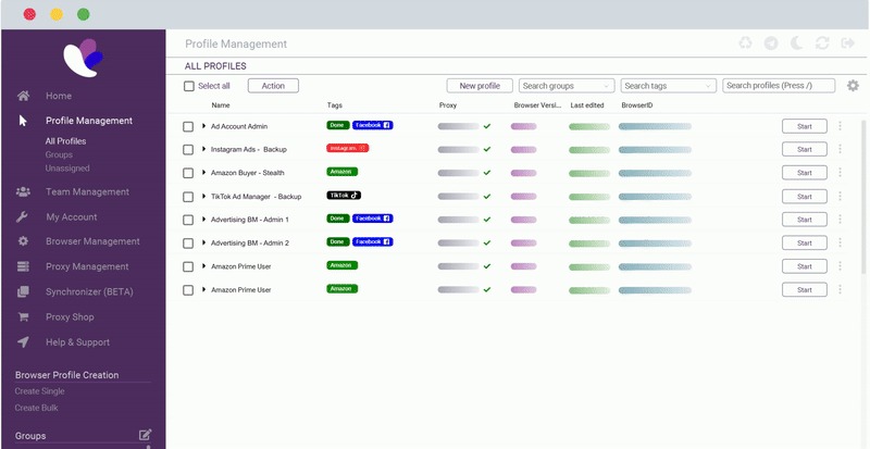 You can assign a separate proxy to each profile, which allows you to separate not only the browser, but also the network environment. Resident, mobile, and datacenter proxies are supported, as well as HTTP(S) and SOCKS5 protocols. This allows you to configure the connection geography and reduce the risk of blockages when working with accounts en masse.