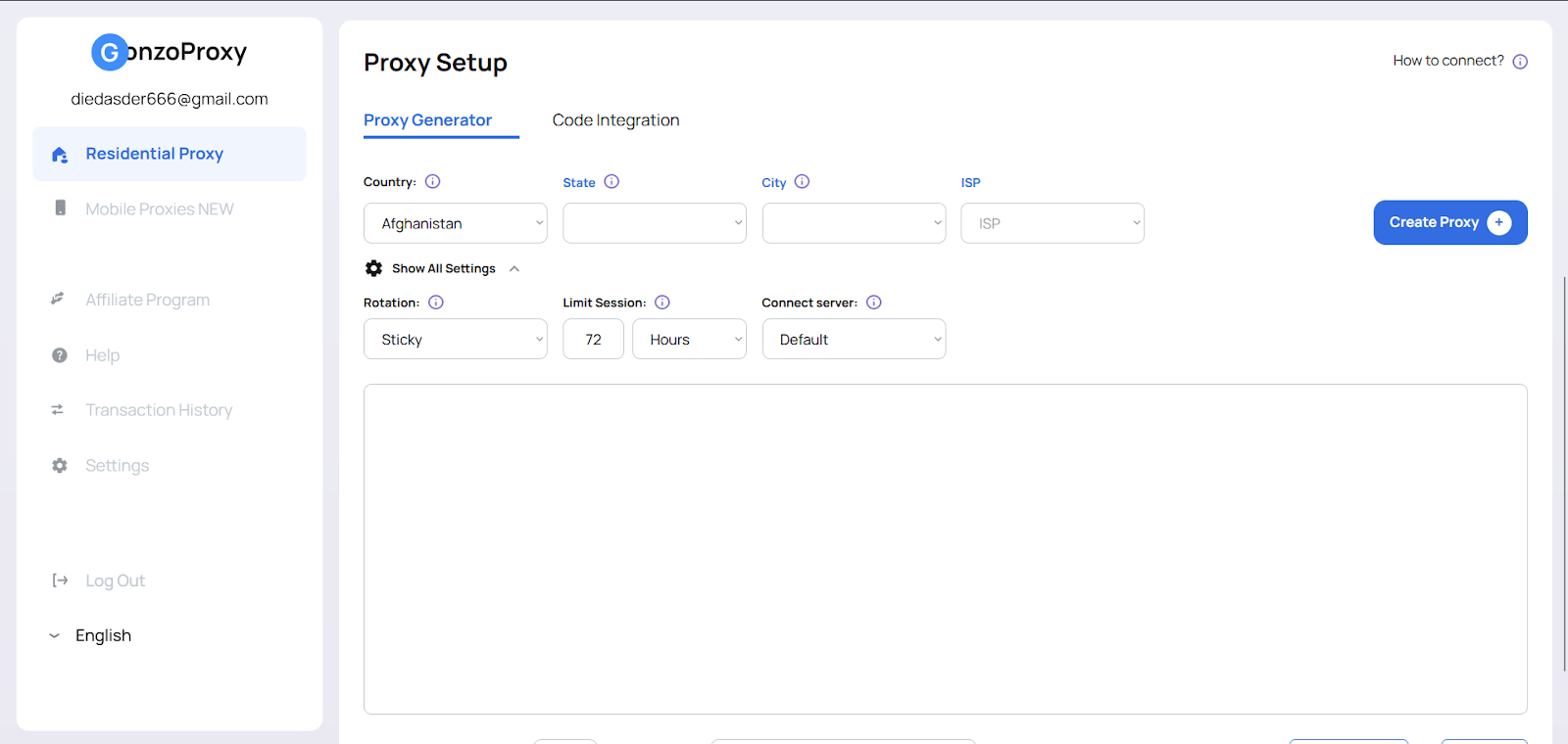 Access GonzoProxy dashboard at gonzoproxy.com. Registration takes 30 seconds via Google account - no documents or verification needed.