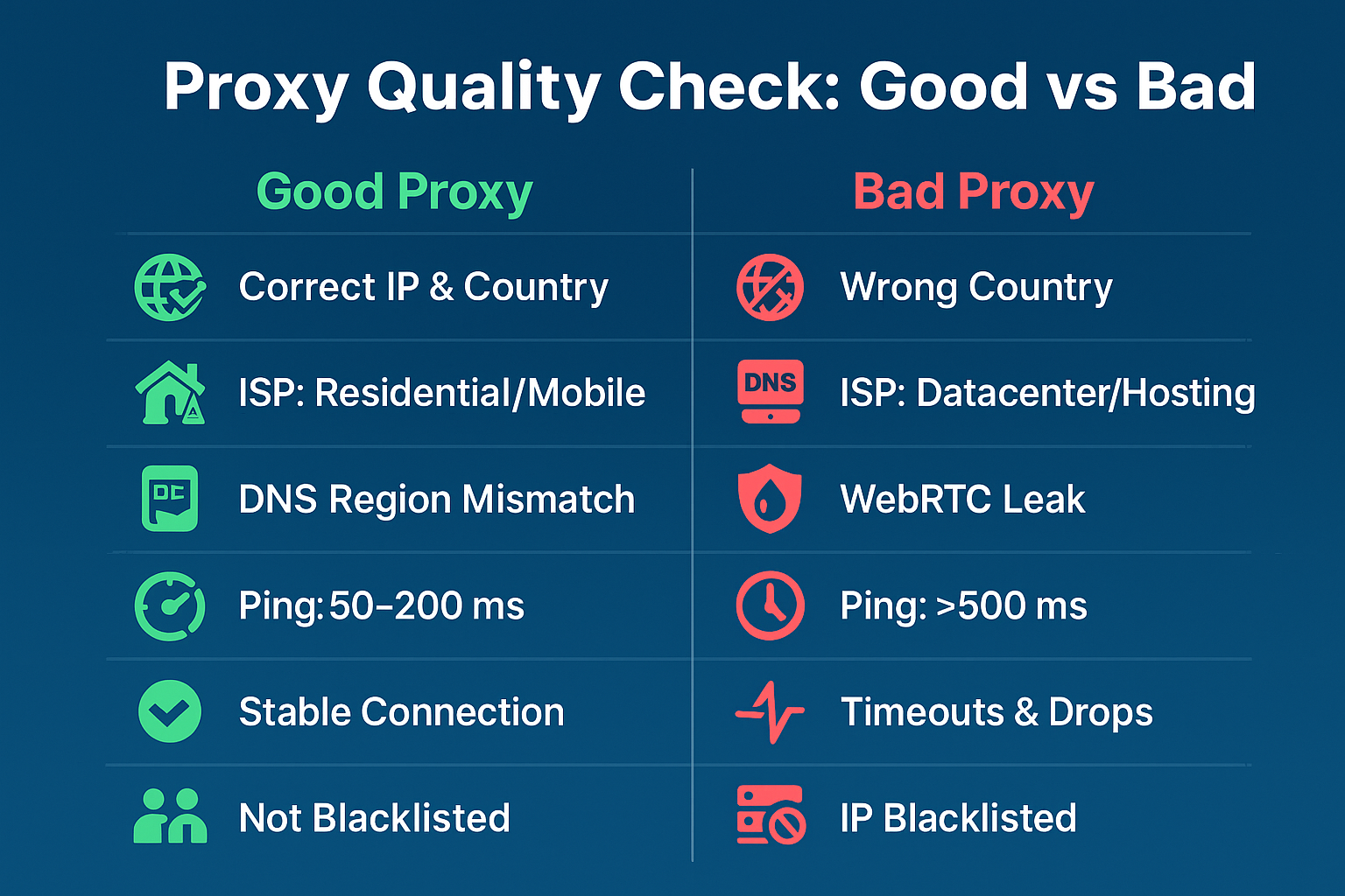 IP matches settings. Provider determined as residential or mobile. No WebRTC leaks. Ping is 50-200 ms. No blacklist records.