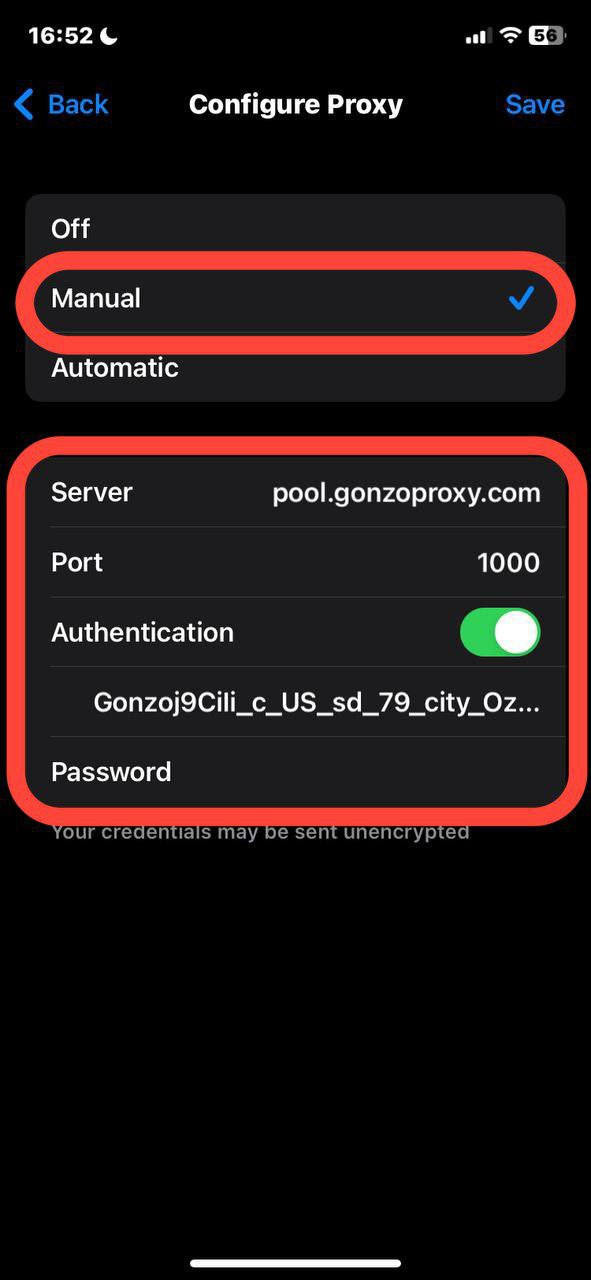 3. Scroll down to "Configure Proxy". Change "Off" to "Manual"