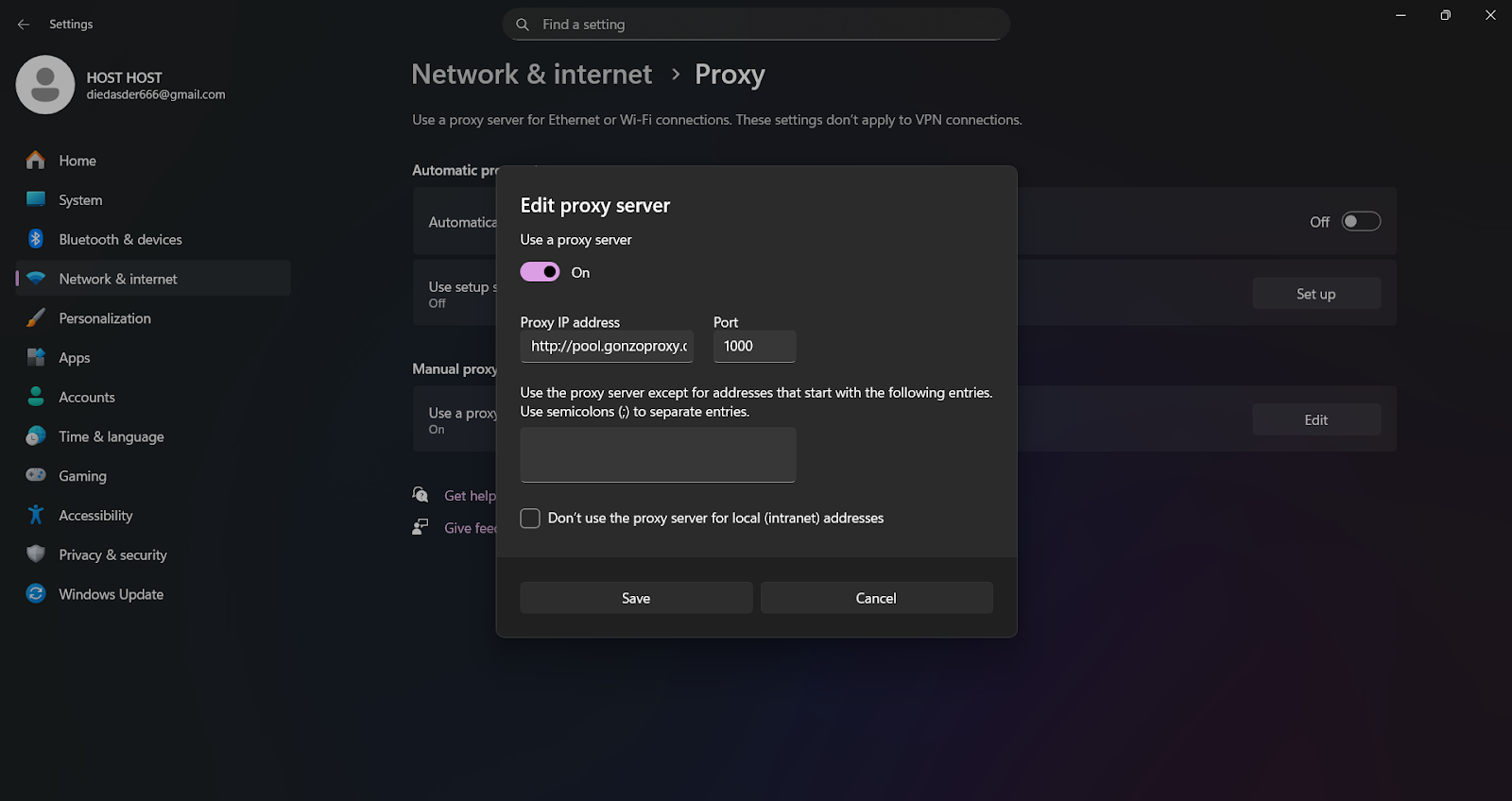 - Turn on the "Use proxy server" toggle. In the address field, enter IP from GonzoProxy panel and port. Click save.