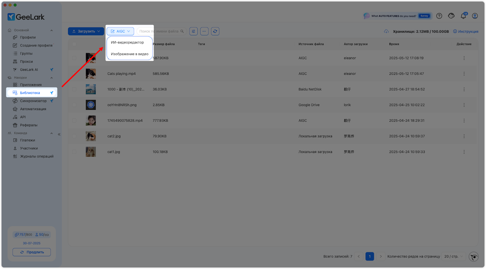 GeeLark также предлагает отличные AIGC-функции, такие как видеоредактор и конвертер изображений в видео, которые находятся в Библиотеке, чтобы упростить создание видео.