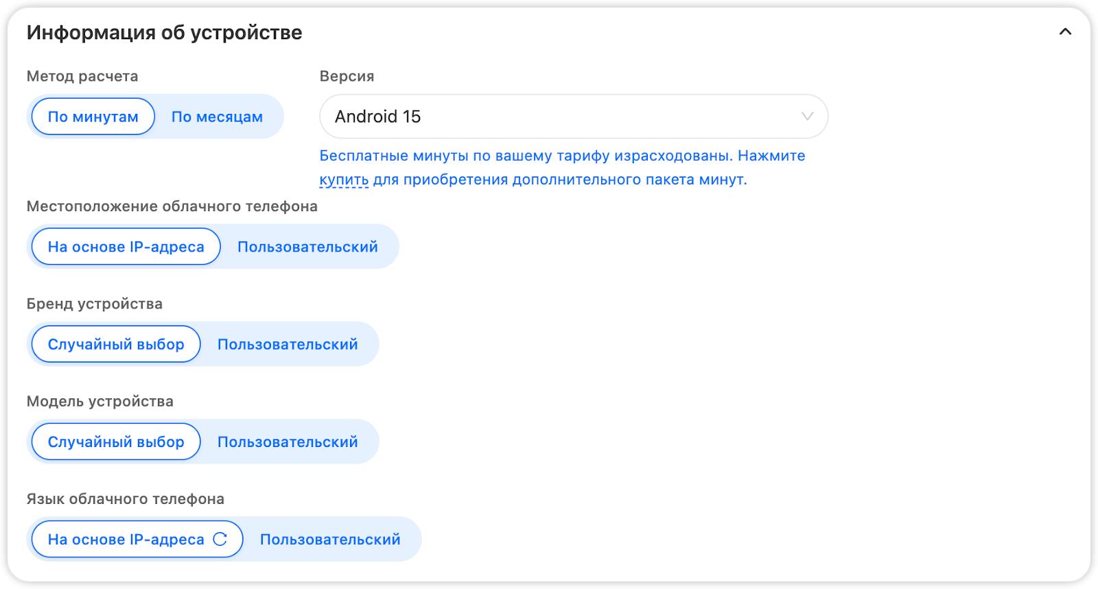 5. Выберите предпочтительный способ оплаты (подробнее о плате за облачный телефон читайте здесь) и нужную версию ОС (различия между версиями ОС можно найти здесь). Вы также можете выбрать конкретную марку и модель телефона.