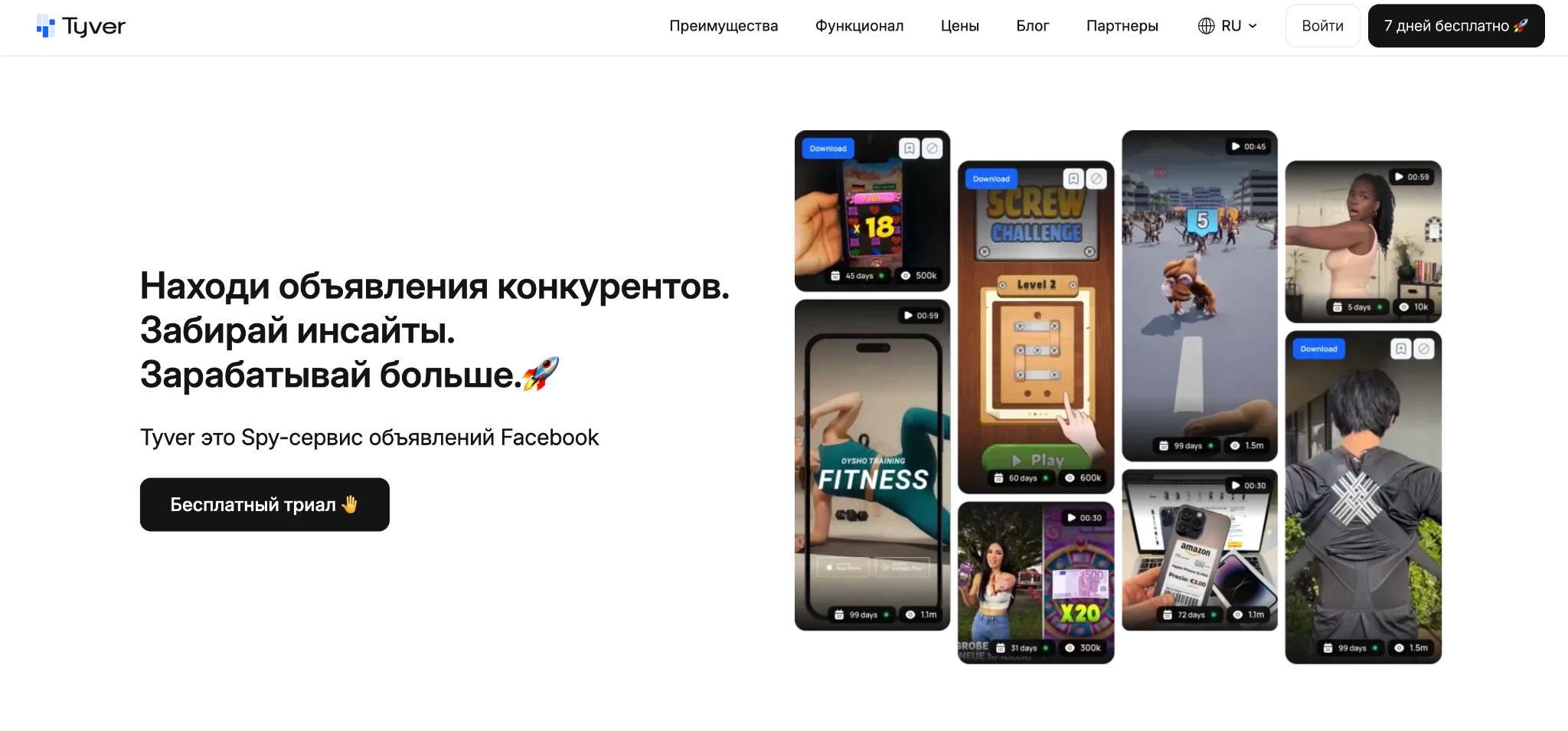Tyver — это мощный ad spy tool для арбитражников, медиабаеров и маркетологов, который помогает находить и анализировать рекламные креативы в Meta Ads (Facebook и Instagram). Сервис ежедневно собирает более 3 000 000 объявлений, что дает доступ к максимально актуальной базе и позволяет быстро находить рабочие связки в любых вертикалях: гемблинг, нутра, e-commerce и другие.