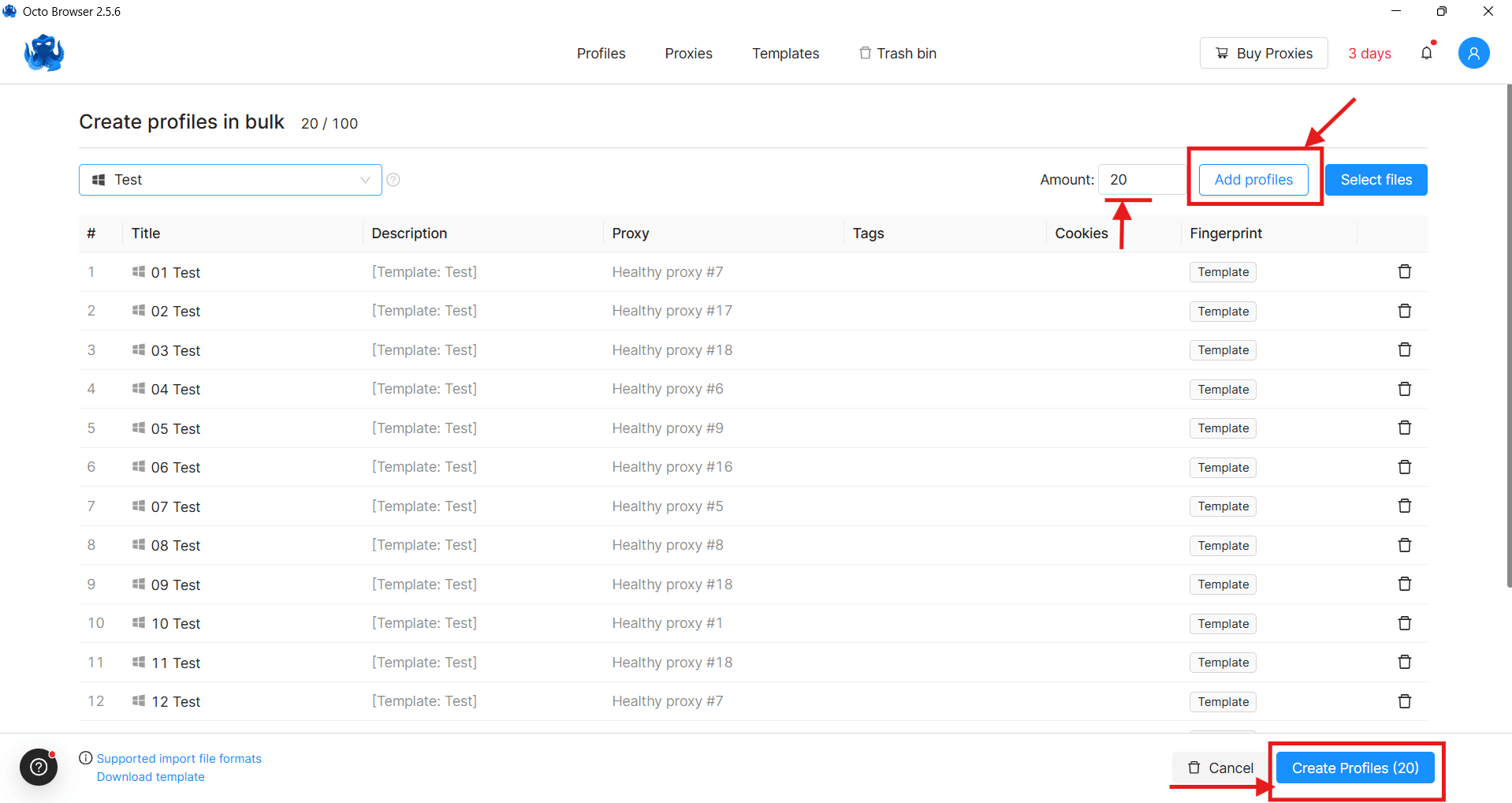 Пример создания 20 профилей с резидентскими прокси в OctoBrowser