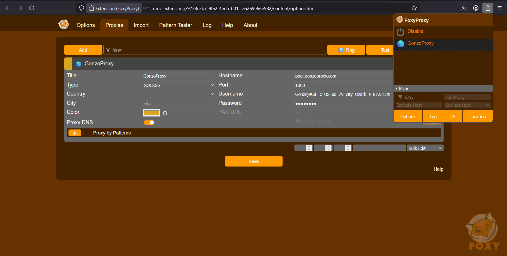 - Например:Сервер/Хост: pool.gonzoproxy.com